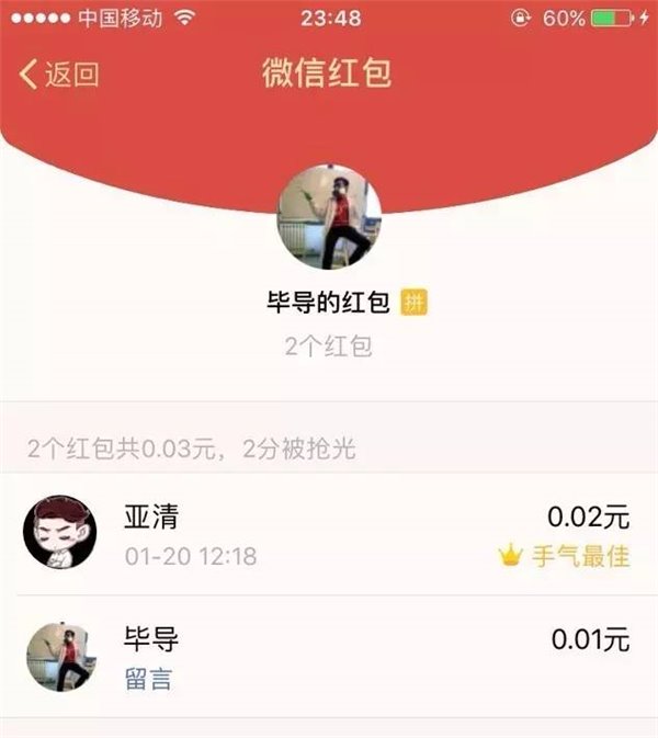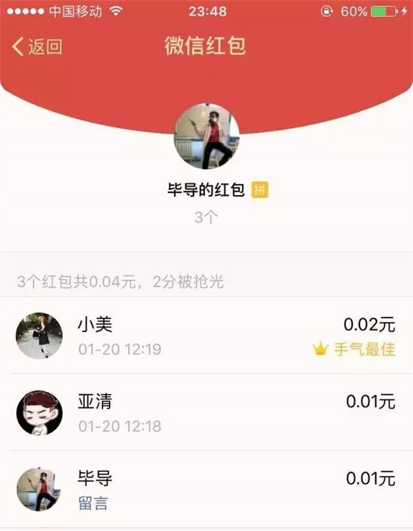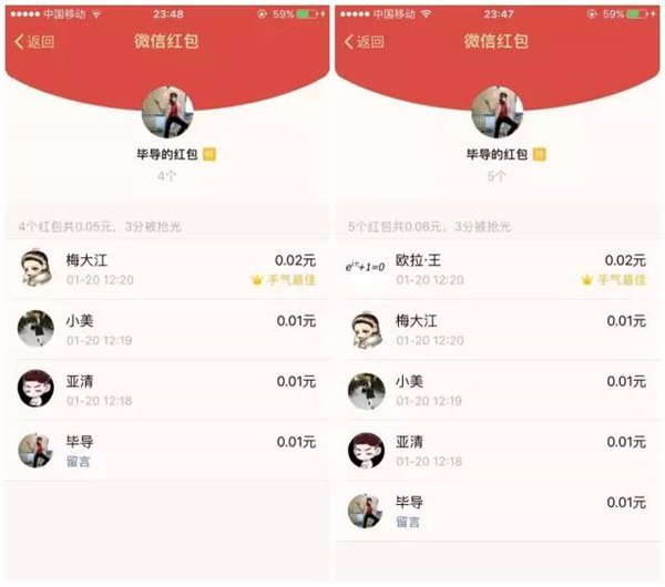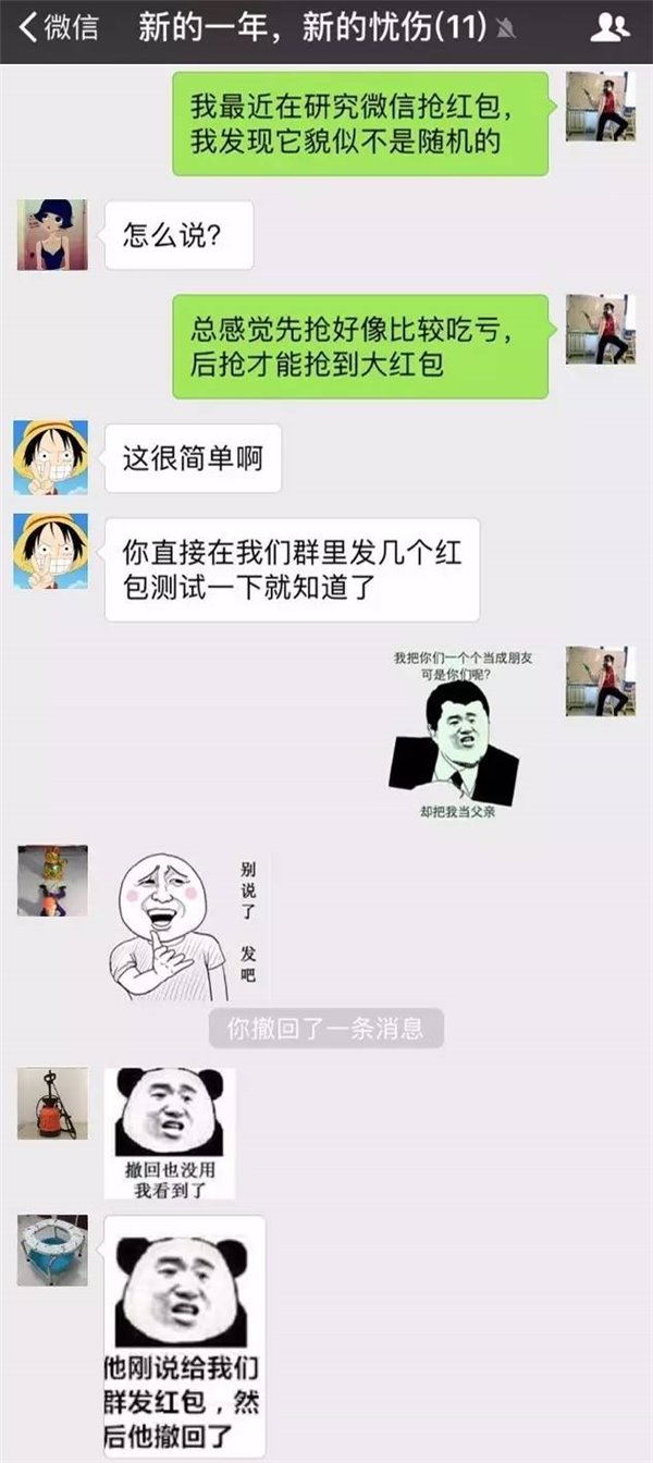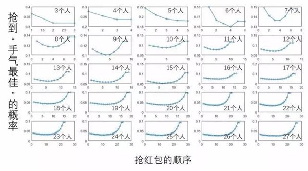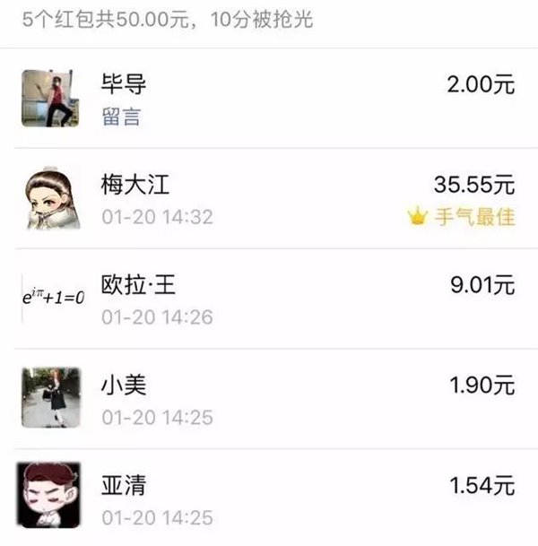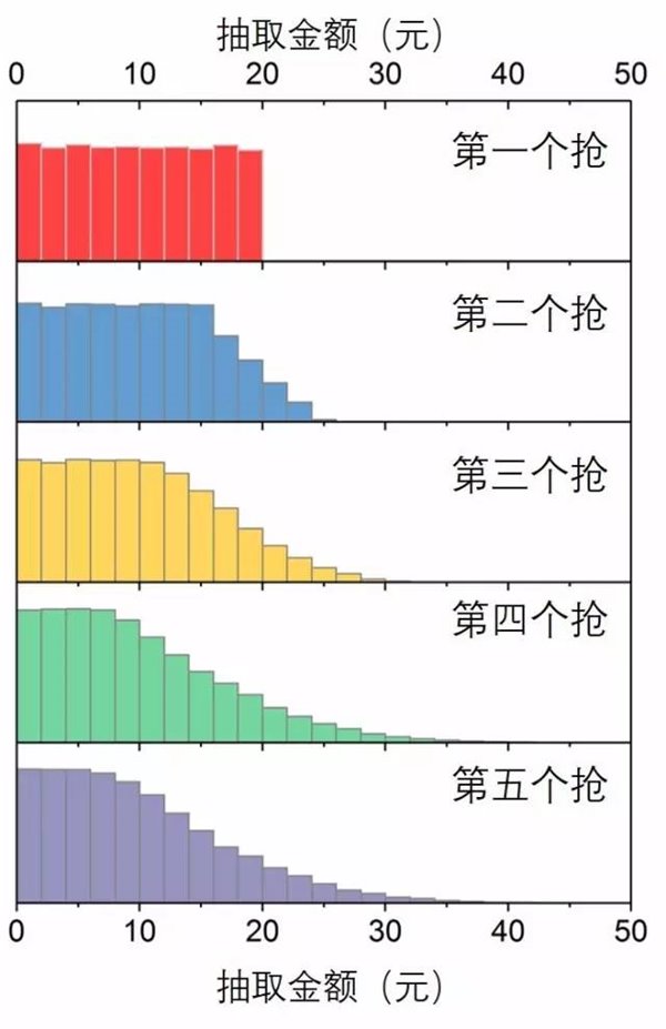 春节是中华民族隆重的农历新年 这是世界上规模最大的节日 在春节前后 炎黄子孙们不远万里衣锦还乡 与亲人们团圆 在此期间 中国的铁路上会发生 地球上最大规模的人口迁徙 作为世界上最能吃最能玩的种族 聪明勇敢的中国人发明了非常多的娱乐活动 比如 贴春联、放鞭炮、看春晚、接财神、吃饺子…… 以及……抢红包…… 人们抢微信红包的心态是一件很有趣的事 拼死拼活拿了几分钱还激动到爆炸! 感觉就像是一帮人大老远地好不容易欢聚一堂 然后他们一起在垃圾堆里捡矿泉水瓶 如果你在春节期间,愿意远离微信红包的诱惑,戒除自己的手机控,和好久不见的亲戚们聊聊天,看看久违的春节联欢晚会,你很快就会发现,还是微信抢红包最好玩…… 看看近三年来的微信红包数据就知道抢红包有多么火! 去年光除夕一天全国人民就发出了80.8亿个红包! 图1.部分重要节日的全国微信红包数量 抢红包已经超越了红包本身,成为了一种独特的社交方式,是中国人在春节前后释放情感、满足心理诉求的重要载体。 抢红包也让很多人深刻了解到,自己不仅穷、贪婪、聒噪、懒惰,而且运气也非常糟糕。 不是吹牛,我周围没有人敢和我拼抢红包手速。然而作为一个人品差到极点的人,我经常能在人均几十块的大红包里稳稳地第一个拿下几分钱。 这大概就是稳稳的幸福吧…… 相信许多人都和我一样有一些直觉 比如抢红包貌似后抢比先抢能拿到更多的钱? 比如抢红包的金额是和人有关的? 老子要测试也不会给他们测试! 目前国内外关于抢红包的理论研究十分匮乏,尽管许多人都认识到了抢红包策略的重要性,但绝大部分人都只停留在了感性的、经验的层面上! 我想我有必要对抢红包这件小事开展系统的研究,把它提升到理论的高度!并给出抢红包的最优策略! 下面,请大家跟随我的思路,一点点破解抢红包的奥秘。相信等你看完全文的那一刻,你会成长成一个和我一样优秀的红包教父。 一、微信红包,先抢后抢究竟公不公平? 直接先亮出答案 不!公!平! 看到这里许多读者可能会大吃一惊!不公平这还抢个屁啊!那我应该咋办啊! 但微信红包先抢后抢的确是有区别的! (我们所说的公平,是指随机、均匀,先抢后抢没有区别。比如抓阄就是一个典型的公平规则,不管先抓后抓,每个人抓到的概率和分布都是一样的。) 用一个很简单的抢红包实验就可以证明 比方说有n个人抢一个(n+1)分钱的红包,那结果肯定是某一个人抢到2分钱,剩下的人抢到1分钱。 (你说这不废话么……劳资的抽屉原理在小学的时候就已经通关了) 但如果你真的发一个这样的红包你就会发现一个吼神奇的现象!我称之为“末位红包抽屉原理”(Last red bag drawer principle) 末位红包抽屉原理:n个人抢一个(n+1)分钱的红包,必然是前面的人都抢到1分钱,最后一个人抢到那个2分钱! 下面由我和我的4个小号为大家具体展示一下实验结果 (1)2个人抢3分钱,是亚清抢到了2分钱 (2)3个人抢4分钱,最后一个人抢到2分钱 (3)4个人、5个人的情况,结论都是一样的! 过去我们可能本能地认为,微信抢红包无非就是把一个钱随机分成几份,然后随机分给几个抢红包的人。但我的“末位红包抽屉原理”已经充分证明了微信红包先抢和后抢是有很大区别的!否则就不可能永远只有最后一个人能拿2分钱! 虽然说现实生活中很少会有一个人发几分钱红包而不被打死的情况出现,但是我们的实验已经为探索微信抢红包的原理迎来了曙光! 二、先抢抢不到大的,后抢才能抢到大金额? 还是直接先亮出答案 是!这!样!的! 看到这里许多读者可能会大吃两惊!微信怎么会出这么扯的设计! 但如果你仔细查查自己抢过的红包就会发现,第一个抢的人永远抢不到很大的数。我称之为“先抢抢不到大红包原理”(First rob rob no big red bag principle) 下面我和我的4个小号为大家带来一组抢红包实验! 【实验内容】我发50块的红包,给5个人抢。红包发了210个,记录每次第1个人抢到的金额。(抢的顺序是经过打乱随机的,以排除人品等干扰因素。) 结果表明,第一个抢的人抢到的红包金额分布范围是这样的 图2.第一个人抢到的微信红包金额频数分布直方图 发现这其中的诡异之处了吗? 5个人抢50块红包抢了210次,第一个人竟然永远抢不到20块以上的红包!最高只抢到过19.88元! 也就是说,真正的大红包都只会在后面出现,像这样 为了进一步研究这其中的规律,我准备了大量资金,发个痛快! 【实验内容】定义5个人的标准顺序:毕导-亚清-小美-欧拉·王-梅大江。轮换他们的顺序,在每一种顺序下发50块红包,抢30次,共150次。记录每次5个人抢的红包金额,得到750个原始数据。(如下图所示) 最终得到的五个人抢到红包的金额范围分布是这样的 图3.不同抢红包顺序抢到的金额频数分布直方图 这张图已经可以告诉我们许多规律了