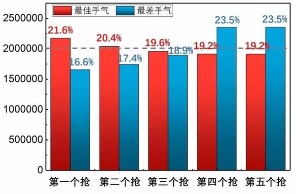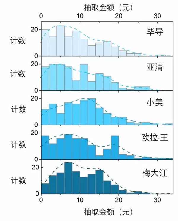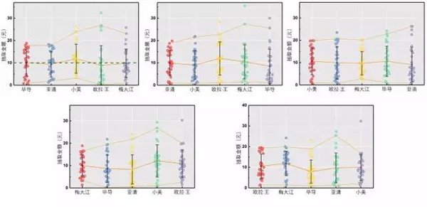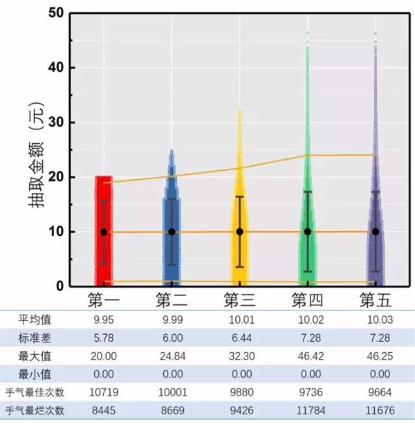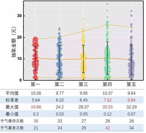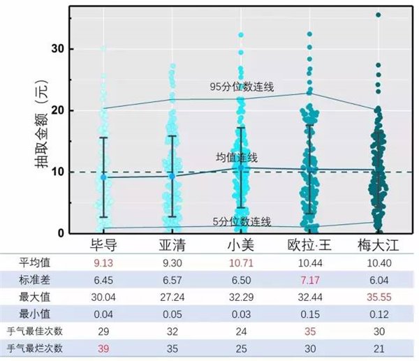 可怕!早在2014年我就已经开始暗自用打地鼠游戏练习抢红包,最终习得一身技艺,指如疾风,势如闪电,可以扫平所有群的所有红包,江湖人称“红包霹雳手”! 然而现在看来,“先抢抢不到大红包原理”已经注定了,正是我超凡的手速让我输在了起跑线上…… 我必须要继续探究出一套最佳的抢红包策略! 三、抢红包和人品有关吗? 在进一步实验之前,我觉得首先得排除一个因素的干扰…… 世间万物都有它运行的法则! 理论上讲,你抽SSR和我抽SSR的概率是一样的,你出敬业福的概率和我也是一样的。但是这个世界就是会分出非洲人和欧洲人,就是有人敬业有人不敬业(我已经集齐五福了,我去年也集齐五福了的嘿嘿) 生活中的种种不公平让我们不得不思考:除了概率之外,还有一种更重要的东西在左右着我们的客观世界——人品! 5个人抢的150个50元红包的结果是这样的 图4.五个人抢到的金额频数分布直方图 呃……至少五个人都能抽到大红包……脸还不算太黑……那么究竟谁最厉害呢?请看下面的散点图以及表格数据 图5.五个人抢到的金额 5个人抢50块,平均每人10块钱 从图上可以看出,5个人的平均值都是在10块钱附近,标准差也都在6~7之间。 但是细细看看统计数据还是有明显差异的…… 我的平均值只有9块1!小美有10块7!这差距也太尼玛大了吧! 我的手气佳次数也很低!而手气最烂次数排名第一! 综合看来,小美的人品最好,欧拉·王其次但是发挥不稳定,下来是梅大江、亚清,人品最差的就是我……可能人品和颜值是成正比的吧…… --“所以微信抢红包这事和人究竟有没有关系啊?” --“人品这种事情,如果能用理论算的话还叫人品吗?” 四、抢红包最优策略是什么! 人品这种虚无飘渺的因素还是撇开不谈了,毕竟大过年的我们也很难在抢红包之前突击扶老奶奶过马路来攒人品(摊手) 抢红包的时候我们唯一能控制的就是先抢还是后抢!另外我记得之前微信群里经常有抢红包的游戏,规则很简单,就是抢到“手气最佳”的人要继续发红包 所以接下来我们的研究任务是!
