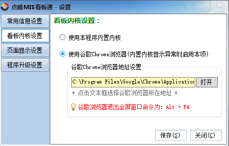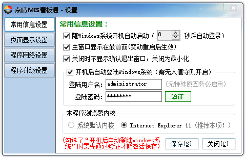 下载并将以上程序解压放在适当的位置,然后找到并打开点晴MIS看板通主程序,进入如下页面: 点击“设置网络”按钮进入到网络设置界面,网络设置分局域网和因特网,如下图所示: 点击“绑定账号”进入到账号绑定页面,如下图所示: 设置完成后,选择对应的账号录入密码登陆,如下图所示: 登陆后务必勾选“记住密码”和“自动登陆”,设置后工控机一开起就可自动登陆自动显示需展示的内容: 进入页面,如下图所示: 页面右上角有设置按钮,有“刷新页面窗口”、“系统设置”、“注销/更换用户”、“关于本系统”: “刷新页面窗口”:点击可对窗口数据进行刷新。 “系统设置”:点击可进入系统设置页面,如下图所示: 此页面设置一些基础参数,“随Windows系统开机自动启动”建议勾选开启,“开机后自动登录Windows系统”建议开启,本程序浏览器内核会强制设置为IE11。 “看板内核设置”: 可以使用本程序自带的内核显示看板内容。如果本程序自带内核显示看板异常,那么可以使用谷歌浏览器来显示看板内容。 “页面显示设置”: 说明:此功能可设置需要在看板中显示的页面网址,显示字体类型、字体大小、每行高度、页面行数显示等信息。 注销更换用户:点击后退出本账户,进入登陆界面。 关于本系统:点击可查看系统的信息,如下图所示: 车间效果展现:
