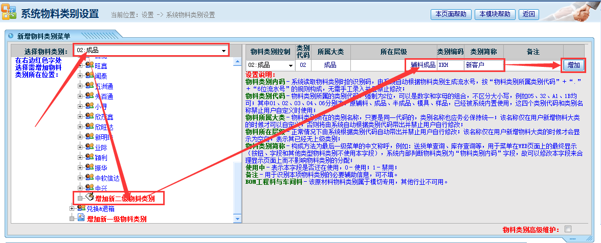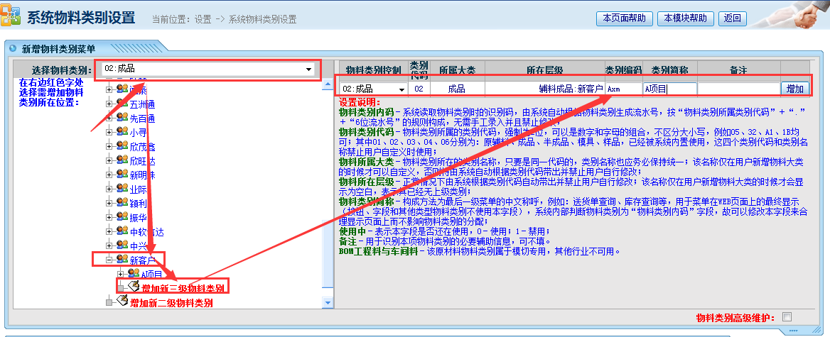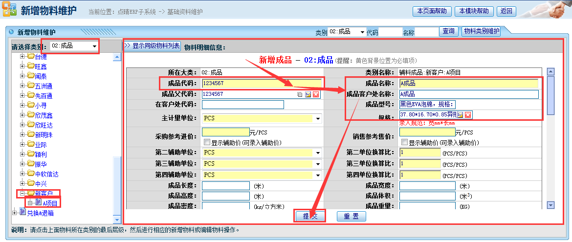 新客户,新项目建资料流程说明(分客户、项目俩级,需依次建类别) 步骤1、新增客户类别 操作菜单位置:系统管理——物料管理——物料类别维护,进入下图所示页面: 如上图所示操作流程:左侧选择物料类别位置选择“成品”——点击展开辅料成品——在最下方点击“增加二级物料类别”——录入客户编号和客户名称(客户编号可用拼音缩写)——点击增加完成。 步骤二、新增项目(型号)类别 操作菜单位置:系统管理——物料管理——物料类别维护,进入下图所示页面: 如上图所示操作流程:左侧选择物料类别位置选择“成品”——点击展开辅料成品——找到新客户展开——在最下方点击“增加三级物料类别”——录入项目编号和项目名称(项目编号可与项目名称一致或录入缩写)——点击增加完成。 步骤3、新增成品详细信息 操作菜单位置:系统管理——物料管理——新增物料,进入下图所示页面: 如上图所示操作流程依次为:左侧类别选择“成品”——找到对应的客户(以新客户为例子)——展开并点击对应的项目(以A项目为例子)——录入成品代码(以客户提供代码为准)——录入成品名称(以送货单打印名称为准)——录入成品型号——录入规格(填键键通尺寸)——录入单位——点击提交完成。 说明: 1、若客户为旧客户,项目为新项目,则只需操作步骤2、3; 2、若客户为老客户,项目也是旧项目只是新增成品资料,则按操作步骤3操作即可 点晴模切ERP更多信息:http://moqie.clicksun.cn,联系电话:4001861886 该文章在 2017/7/10 15:11:36 编辑过 |