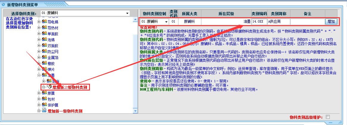 操作菜单位置:系统管理——物料管理——物料类别维护,进入下图所示页面: 如上图操作流程依次为:左侧选择物料类别选择“原辅料”——找到对应的材料类别(以油墨为例)——点击“增加新二级物料类别”——录入对应的类别编号与供应商简称——点击增加完成(14.0XX,此为固定格式,0XX为供应商的编号,14代表油墨的编号;依次的编码为:原膜01、包材02、保护膜03、导电布04、导电棉05、导热材06、单面胶07、泡棉08、双面胶09、防尘网10、金属箔11、橡胶12、弹片13、油墨14)