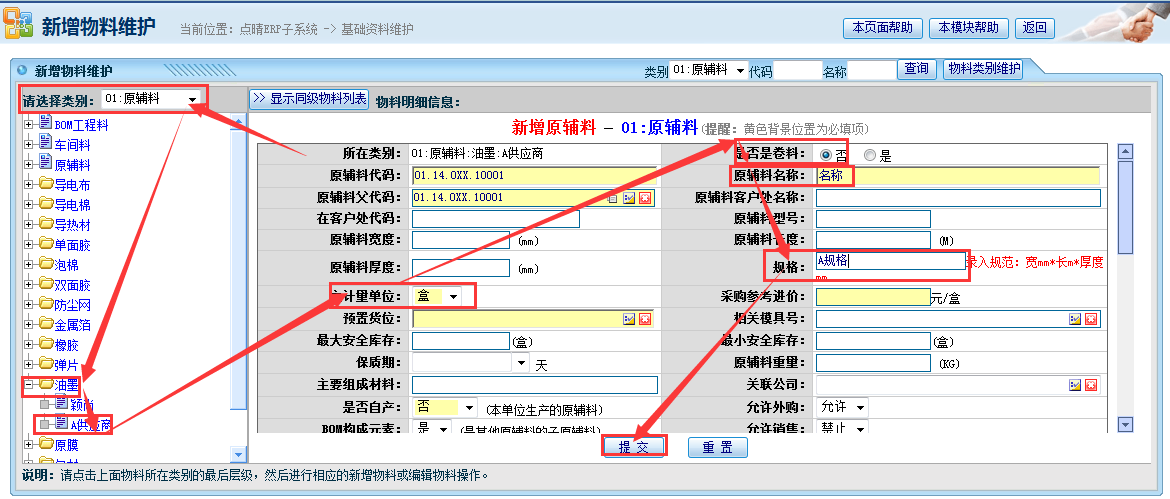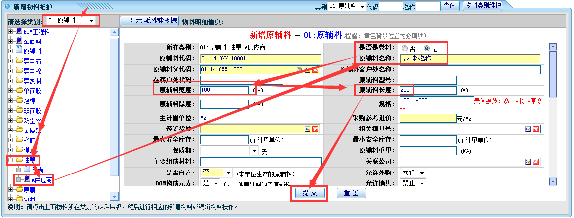 (卷料)如上图所示操作流程依次为:左侧类别选择“原辅料”——找到对应的类型——展开并点击对应的供应商(以A供应商为例子)——选择卷料“是”——原材料代码以系统自动编号为准(不许修改)——录入原材料名称(以采购单打印名称为准——录入原辅料宽度——录入原辅料长度_BOM所在层级选择2级——点击提交完成。