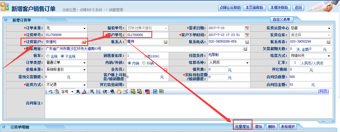 如上图所示,依次操作流程为:注意订单来源选择“无”——选择下单客户——设置客户销售单号——点击“批量增加”