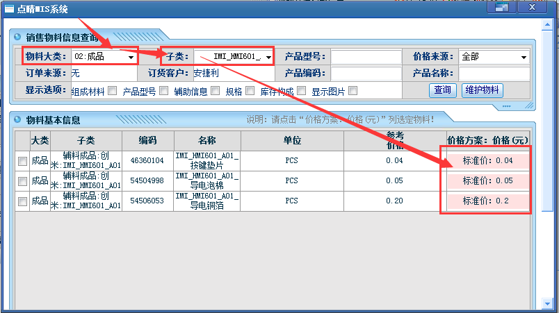 点击“批量增加”后出现物料选择界面,如下图所示: