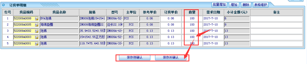 录入对应明细数量——核对或者修改单价——点击“保存待确认”或者“保存并确认”按钮完成。