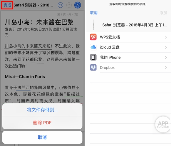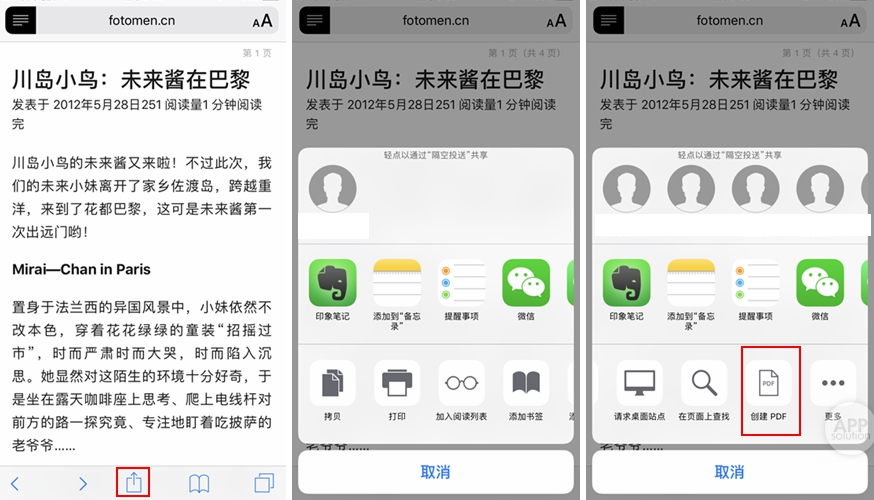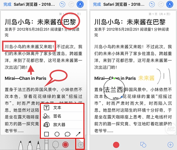 如果我们在网络上看到一篇好的文章,想分享给朋友。如果是一些敏感网页,可能分分钟被微信屏蔽或者被发布者删除,或者分享之前又想做标记,怎么办才最简单快捷?Safari 有一个功能:可以直接把整张网页保存成 PDF,并且支持在上面做标注。 在微信中点击右上角更多图标,会看到“在Safari中打开”: 打开 Safari,进入想截图的页面,如果页面允许的话,最好开启阅读模式,视觉上会更简洁。 点击下方状态栏的「分享」,把最下一栏滑到最后,看到「创建 PDF」,点击。 点击右上角的「标注」,就可以直接在 PDF 上圈圈画画。有三种粗细不同的笔(小头马克笔、记号笔、铅笔)和六种颜色可供选择。 还可以添加文本、签名、放大器和方框箭头。 标注完成后,点击左下角的「分享」,则可以选择一个渠道将其发送出去。 而点击右上角的「完成」,则可以选择保存文件或将 PDF 删除。 要注意的是:如果你在微信直接打开是看不到标注的,需要借助第三方应用,如 WPS、或备忘录等。 PDF 效果如下图,简洁明了,易于保存和转发。 这个功能非常适合用来和朋友分享网上看到的随时可能被关闭的敏感网页或旅游攻略、论文等需要标注的文章。 该文章在 2018/4/8 10:01:35 编辑过 |