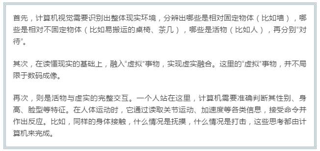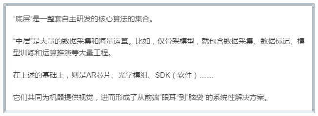 苹果、微软、华捷艾米的新一代AR芯片同步量产,席卷全业的巨变即将到来。 北京北五环,占地2.9平方公里的中关村软件园区内,分布着国内外600家高科技公司的总部和研发中心。 2017年,这片园区贡献了超过2000亿的产值,每平方公里的产值高达805亿,单位密度产出依旧居全国首位。 智慧和财富在此交汇,行色匆匆的路人,思绪里或许正激荡着改变你我生活方式的新东西。 2月,我们在这片园区拜访了华捷艾米的团队。本次到访出于一则留言——稍早前,我们的一篇文章里提到了商汤科技、旷视等专攻“计算机视觉”的企业。这两家风头正劲的企业,分别于2017年拿下了4.1亿美元和4.6亿美元的新轮融资;即便放大到整个资本市场,他们的估值体量也位列第二集团,仅次于小米、滴滴、蚂蚁金服、美团等超级独角兽。 文章发布后,有业内人士留言提醒我们:在计算机视觉、乃至AI+AR领域,真正有望于芯片做出巨大突破的国内企业,或许并不在文章的名单之中,同时还提到了默默攻关技术的华捷艾米,并“提醒”我们不要“人云亦云”。 华捷艾米是谁?它凭什么被这样认可?获知信息后,我们认真查阅已公开资讯,得到两条比较关键的产业信息:2018年6月左右,3家企业的手机芯片即将实现量产,分别是微软、苹果和华捷艾米。而在全球范围内,也仅有这3家公司具备完整的智能AR技术体系(包括人物提取、骨架识别技术和动作跟踪技术等)。 这堪称惊人的信息背后,到底隐藏着一家怎样的至今不广为人知的公司,为了揭开它神秘的面纱,我们赶往了华捷艾米的北京总部,并在那里看到了“AI的眼睛”。 对于AI(人工智能),很多人早已审美疲劳。从没有哪项技术像AI一样,还未真正面世,便挑起轩然大波。舆论每天都面临AI新闻的密集轰炸,但深刻改变生活的AI技术从未到来。 从企业到市场,AI划过了一条泾渭分明的线。 几乎所有大型的科技企业,都在为之展开“军备”竞赛:上游产业链的英伟达,由GPU芯片更迭至AI芯片后,市值在2年内翻了10倍;中游的亚马逊,几乎将“深度学习”融入了产品的每个环节,成为AI市场的最大赢家;谷歌疯狂烧钱,隔三差五便爆出革命性的AI黑科技,但始终停留在新闻阶段;国内,百度正式转型为AI公司,阿里和腾讯为之持续并购;BAT之外,一众初创公司打着AI的理念,产品没成熟,便收获了天价估值…… 这些企业努力描绘着AI震撼人心的应用场景,但民众认知中的AI却是另一幅景象:几年来,除了吊打各路英杰的“阿尔法狗”,鲜有其他具象且具影响力的AI成果出现。基于这份落差,甚至有人将人工智能称为“人工智障”:吹起来比天大,学啥啥不行。 到底什么是AI?它什么时候才能改变我们的生活?这个宏观的问题,可以做如下总结: 从发展阶段看来,AI可简单分为三类:弱AI、强AI,以及超AI。 弱人工智能是擅长某个单方面的AI,比如阿尔法狗能把柯洁打到崩溃,但你要让它识别动物,它也得崩溃。弱AI的范畴相当广,只要涉及归纳、运算,并得到自动化结果的,都属其中。比如百度依托大数据,根据你的兴趣推了条新闻,这就算弱AI;亚马逊的无人机自动识路送货,算弱AI;波士顿动力的Atlas机器人一个炫酷到爆炸的后空翻,同样只算弱AI。 目前以及未来一段时间可见的,所有关于人工智能的研发与成果,都只能算是弱AI。普通民众想象中的人工智能,包括终结者、星球大战等虚构事物,都是强AI和超AI。强AI指的是人类级别的人工智能,超AI则指在几乎所有领域都比最聪明的人类还聪明,代表AI终极形态的人工智能。 即便是弱AI领域,成果的差别也堪称巨大,个性推送和无人驾驶显然无法类比,后者涉及的计算机视觉、深度学习以及数据统筹的难度是前者的几何倍数。 一言以蔽之,部分AI已经作用于我们的生活,但是效果不明显;而那些效果明显的,比如高智能机器人、无人驾驶等,离我们还很遥远。 现在的AI大环境,更像是一个“有机分裂”的整体,不同公司、细分行业,研究的是弱AI的某个点,而这些点最终、也必然会结合成为强AI,彻底颠覆人们的生活。 引用学术界的观点就是:现在的弱人工智能就是地球早期的氨基酸,它们会在某一天突然组合进化成为生命。至于这一天是什么时候,谁也说不准。 在弱AI“进化”的过程中,有一个经典的认知误区:那些你认为很难的,对于电脑而言巨简单,而那些你认为特“弱智”的,对于电脑而言巨TM难。 比如,解一套微积分题,电脑可以秒出结果;但识别放在面前的是一棵小树还是一株大草,对于电脑而言则极端困难;架构一套金融市场的策略模型,对它来说轻而易举;而读懂幼儿的图书、真正理解各种词意——谷歌为此花了几十亿美元,还没做出来。 人类觉得特别容易的事情——视觉、动态、移动,甚至直觉,对于电脑而言难于登天。伸手拿起一件东西,是人类在经过几亿年的进化后,不需要思考便能完成的事情。我们有着全宇宙已知的最复杂的东西——人脑,各处肌肉和关节、以及视觉,在人脑的指挥下瞬间配套完成各种物理工作,这是人类的本能。 这种本能,对于电脑而言恰恰是最难的——现在的电脑连网站的验证码都看不懂,能分辨猫狗的计算机,就能称得上“超级”AI。 看懂、听懂都做不到,怎么能进化成强AI?因此,弱AI的首要难点,便是解决包括计算机视觉在内的各类“基础”问题。 AI从看、思考到做出反应,是一个非常复杂的工程。业内反复强调的“深度学习”、