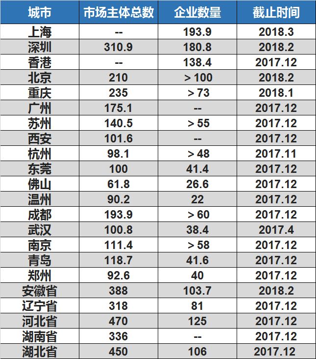 由于缺少关键统计数据,或者数据失真,在中国研究经济问题难度很大。 地方政府的“常住人口”、“GDP”参考价值不大,过去几年,在研究城市竞争力和房价上涨的时候,我率先提出了两个重要替代指标——“小学生人数”和“金融机构本外币存款余额”(资金总量)。 如今,这两个指标的有效性已经被广泛接受,频繁出现在各种研究报告里。 其实在研究城市竞争力和楼市走势中,还有多个指标值得参考,比如“居民用水用电”变动幅度,“城市生活垃圾”的变动幅度,“城市的快递业务量”等等。 今天,我想跟大家探讨的一个重要指标是:一个城市的商事主体(市场主体)数量,与城市竞争力、房价的关系。也就是在工商局(市场监督局)登记的企业数量、工商个体户的数量。 昨天(4月10日),上海有媒体发布新闻说:截至今年3月,上海累计企业数量达到193.91万,相当于每1000人拥有77户企业,这一密度居中国首位,并超过伦敦、东京等大都市。 其实“每1000人拥有的企业数量”,上海不仅远远低于深圳,还远远低于香港。 在市场主体的统计和信息公开上,深圳是做得最好的。基本上每月的数据报告都可以查到,其他城市基本上查不到。如果以媒体公开报道的193.91万家企业来看(截至今年3月末),上海的确是超过了深圳、香港,但深圳、尤其是香港的人口要比上海少很多。 深圳的数据是:截至2018年2月25日,市场主体总量(企业及个体户)共310.9万户。其中,累计企业180.8万户,累计个体工商户130万户。 香港的企业数量是138.4万户,相当于上海的70%,但香港的人口不到上海的三分之一。 一个城市市场主体数量越多,尤其是企业数量越多,这个城市的经济越活跃、越发达,这是毫无疑问的。 另外,一个城市市场主体占全省的比例越高,在这个省份里的地位就越高,资源集中度就越高。同样,在一个城市里:市场主体、新增市场主体集中的区,显然经济更活跃,房价更容易上涨。 但遗憾的是,很多省市都不及时公布市场主体数量,我们只能在网上查到只言片语。下面是一些城市公布的数据: 部分省市市场主体数量(单位:万) 2014年开始,中国启动了商事登记制度改革,再加上国家提倡“大众创业、万众创新”,各地企业“市场主体”都在大幅增长。 截至2018年3月16日,我国各类市场主体总量超过了1亿户(其中企业超过了3100万户),五年增加70%以上。当然,在这个过程中也产生了大量僵尸企业,国家工商总局此前的统计显示,新增市场主体中的30%并未真正运作,属于“泡沫”。 即便是市场主体数量有“泡沫”的成分,但仍然是一个重要的参考指标。通过上述表格可以看出,各地经济活跃度、创业活跃度差别很大。 据4月11日“苏州日报”的报道:目前全国市场主体规模最大是深圳,为300万户,其次为北京、上海、重庆,在200万到250万户之间,100万到150万户有7个城市,分别是苏州、天津、南京、青岛、武汉、杭州、东莞。 如果剔除个体工商户,仅看企业数量,上海、深圳、香港处于第一阵营,北京企业数量暂未查到,但应该在100万家左右。此外,重庆、广州、成都、南京、苏州、杭州企业数量排位靠前。这说明,这些城市的经济相对比较发达,创业活跃度比较高。 市场主体数量在各省的分布是不均匀的,从分布情况,我们可以判断出各省人口和经济相对集中的地区。 比如,根据四川省的《2017年全省市场主体发展报告》我们可以知道: