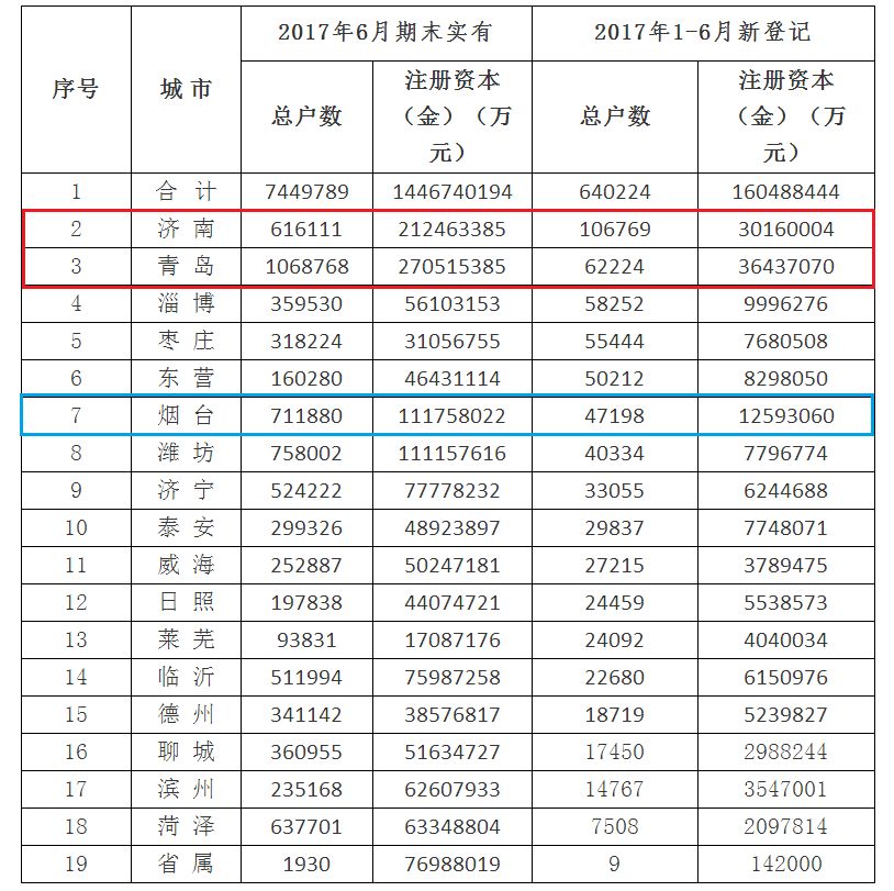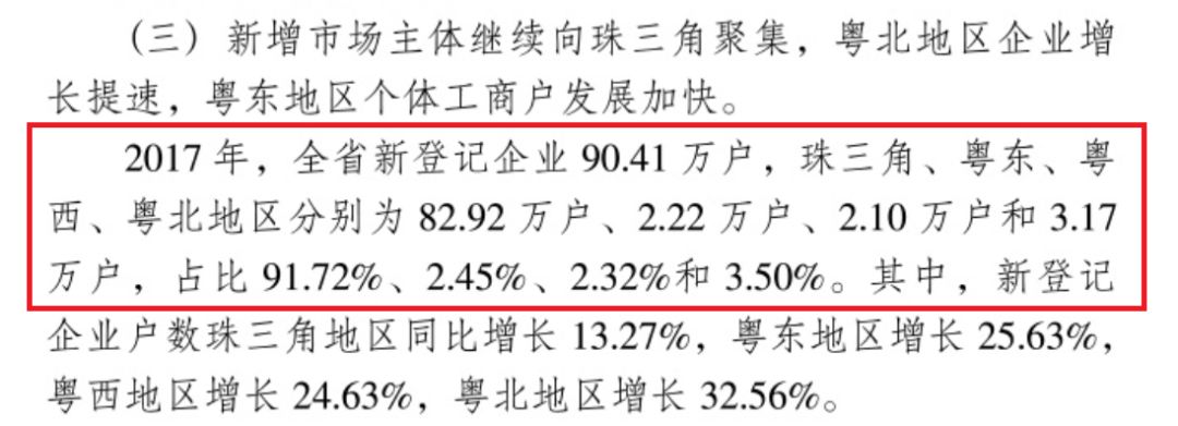 从上面数据可以看出,成都在四川具有绝对优势,市场主体占了全省的将近40%,新增市场主体则占了45%,新增注册资本则占了61%。很显然,资金和人口在加速向成都集中。 在这样的省份买房子,只能选择成都,其他任何一个城市都无法跟成都抗衡。 再来看看山东的情况: 上图是截至2017年上半年末的市场主体分布情况,可以看出山东经济高度均衡,济南的市场主体数量,竟然只能在省内排第五名,不但比青岛、烟台少,还比潍坊、菏泽少。而临沂、济宁的市场主体数量,也跟济南差距不大。 但值得注意的是,新增市场主体济南位居第一,新增注册资金也遥遥领先于除了青岛之外的其他城市。这说明人口和资金有向济南集中的趋势,事实上济南汇聚的“资金总量”在过去几年已经超过了青岛。省会城市的优势,正在慢慢发挥作用。 下面是截至2017年末,广州、深圳和广东省的市场主体数量: 1、广东省市场主体1026万户,其中企业420万户; 2、深圳市场主体306万户,占全省30%;企业177万户,占全省42%; 3、广州市场主体175万户,占全省17%,企业数量不详。 由此可见广东省的创业中心显然是深圳,深圳企业数量或许已经达到了广州的近两倍!另外,东莞的市场主体数量大幅超过了佛山,虽然东莞GDP和资金总量仍然低于佛山,但企业数量的大幅超越,可能预示东莞经济比佛山更有活力。 至于广东全省,企业注册高度集中在珠三角(见下图)。这告诉我们,珠三角之外没有楼市可言,只有房子。 在一个城市的内部,市场主体的分布也是不均匀的。以深圳为例,2017年新登记企业36.3万户,在各区的分布情况是: