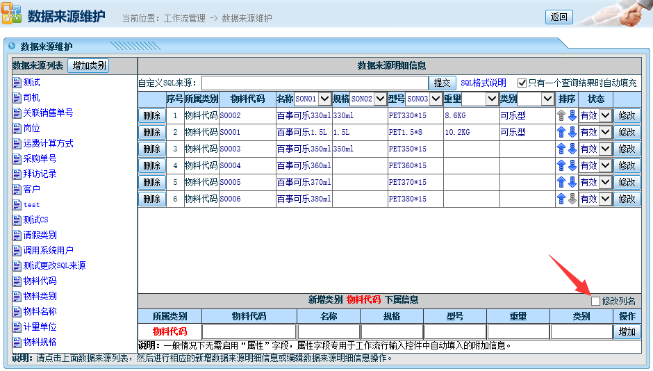 ![]() ![]() ![]() 进入工作流自定义SQL数据源界面,勾选“修改列名”: 勾选后,就会出现自定义列名行: 点击修改后,就会看到所有列名位置都已经被更换为自定义列名了: 以及工作流申请界面的自定义数据库字段也更改了: 相关教程: 该文章在 2018/4/20 15:54:50 编辑过 |