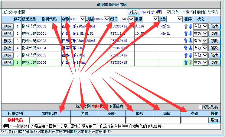 工作流自定义SQL数据源时,如何更改各个数据列的名称?现在显示的是属性1、2之类的