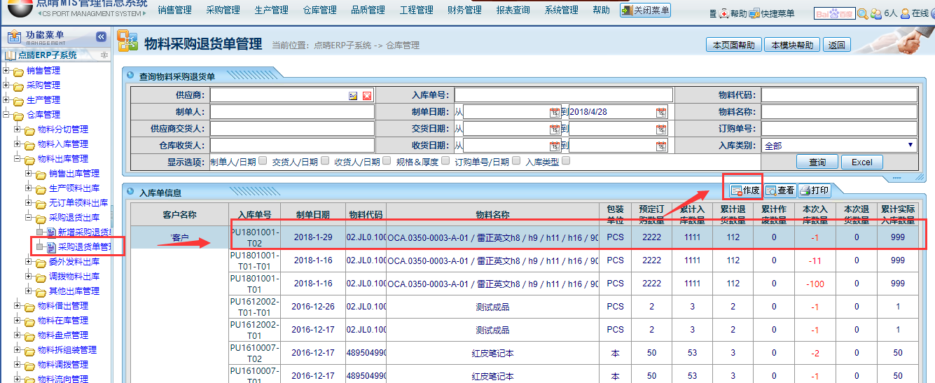 采购退货做错了,如果驳回作废。重新退货呢。 进入退货管理,选择需要作废的退货单。点击作废。 点晴模切ERP更多信息:http://moqie.clicksun.cn,联系电话:4001861886 该文章在 2018/4/28 18:01:39 编辑过 |