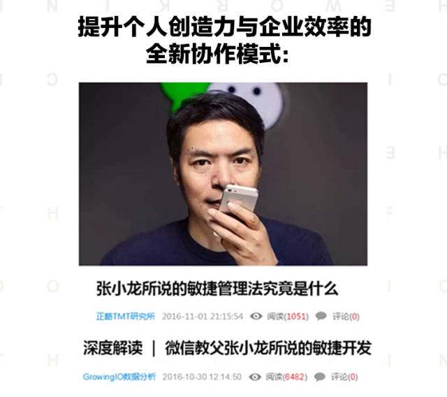 作者 DS 8亿用户的微信是中国历史上最成功的互联网产品,没有之一。 除了张小龙带领的微信团队在产品上极度尊重用户的需求,保持克制和优雅的产品理念。 最重要的就是微信团队在成立初期就坚定的使用「敏捷」方法,时刻关注组织的「敏捷」性。 「敏捷」到底是什么? 先从字面上理解,顾名思义,「敏捷」一词包含了两层含义: 一是「灵活」——检查调整,游刃有余; 二是「快速」——天下武功,唯快不破。 什么意思?
