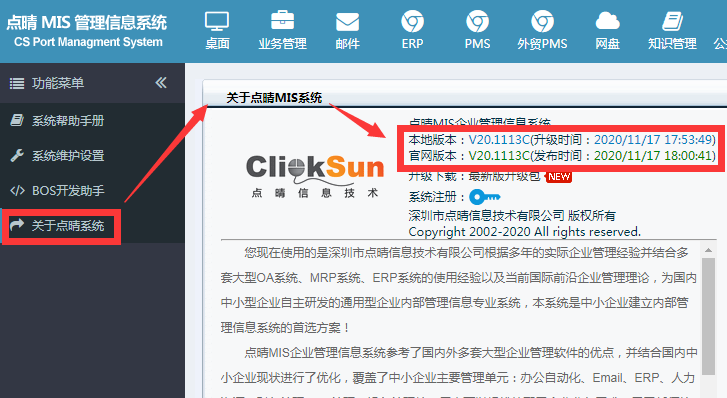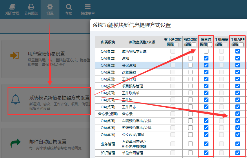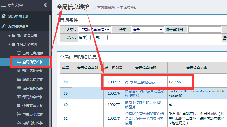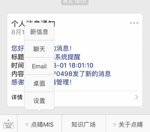 2、升级点晴OA服务器到最新版,设置微信OA连接验证码 接到点晴客服已经开通的通知后,下载最新版升级包,将点晴OA服务器升级到最新版,升级包下载地址及升级方法说明:http://u.oa22.cn 说明:点击设置-》系统维护设置-》关于点晴系统,检查点晴OA的版本,必须是V18.0731C或以后的版本,其中的数字表示2018年7月31日发布的C版本,这个版本之后才支持点晴MIS信息通微信版。 然后网管在点晴OA系统全局变量维护中,找到"微信OA连接验证码"项目,默认是:clicksun,管理员应该将它改为其他密码,并告知本单位内所有需要使用微信OA的用户,下面登录微信OA时需要用到这个连接验证码。 3、网管务必通知各个用户,要各个用户自行在以下位置勾选需要提醒的模块 检查个人设置,前往 “设置-》系统功能模块新信息提醒方式设置” ,在“信息通提醒”列,将需要提醒的模块打勾。 4、升级点晴MIS信息通后台服务程序到最新版,设置启用微信OA发送后台服务 下载最新版升级包,将点晴OA服务器上的点晴MIS信息通后台服务程序升级到最新版,升级方法参见教程(http://12978.oa22.cn),然后重新打开该程序-》设置,勾选“启用微信OA发送后台(非手机APP付费单位勿勾选)”,SMS服务器地址留空不填: 说明:检查点晴MIS信息通后台服务程序版本,必须是V18.0807A或以后的版本才支持点晴MIS信息通微信版后台新信息推送到微信,如果未勾选上述项目,手机微信上将无法接收到点晴OA中推送的新信息提醒。 5、各个用户开始使用微信OA 通知本单位需要使用点晴MIS信息通微信版的用户,用手机微信扫以下二维码关注公众号:点晴管理之道 ![]() 说明:关注公众号点晴管理之道后,务必记得将本公众号设置为置顶,以方便日后接收新信息和随时登陆进入点晴OA系统进行相关操作。 公众号点晴管理之道下面的有三个菜单:点晴MIS、知识广场、关于点晴。点击“点晴MIS”,就会看到五个菜单:新信息、聊天、Email、桌面、设置: 这五个菜单对应着点晴MIS信息通手机APP下面的五个卡片页,两者功能基本一致。任意点击这五个中的一个卡片页,就会看到以下页面: 在上面账号信息位置填入与手机APP一致的用户名和密码,在单位信息处输入单位名称全称(一定要与点晴官网注册单位名称完全一致)、连接验证码(就是上面第2步设置的连接验证码),就可以顺利登陆进入点晴OA了。 下面是部分界面截图: 新信息列表页面