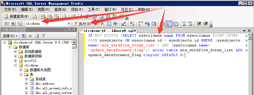 ![]() ![]() ![]() 出现这个错误的原因是用户电脑中实名名称不是默认的dbo,手工设置为了clicksun,需要在OA服务器中,打开数据库管理器,找到表:clicksun.update_dateformate_flag,将其删除,然后再手工创建该表。 先打开SQL Server数据库管理器,找到表:clicksun.update_dateformate_flag,将其删除,然后再手工创建数据库表:update_dateformate_flag,SQL创建语句如下: IF NOT EXISTS (SELECT syscolumns.name FROM syscolumns RIGHT OUTER JOIN sysobjects ON syscolumns.id = sysobjects.id WHERE (sysobjects.name='mis_workflow_forms_list') AND (syscolumns.name='update_dateformate_flag')) alter table mis_workflow_forms_list ADD update_dateformate_flag tinyint DEFAULT 0; 在SQL Server Management Studio(SQL Server管理器)中,点击新建查询,找到数据库:clicksun,然后执行以上语句即可: 如果OA服务器的SQL Server数据库管理器中还能看到其他clicksun.开头的数据库表,都需要手工删除,重新创建,没有的SQL创建表语句,请联系点晴公司获取。 该文章在 2018/8/20 22:47:18 编辑过 |
