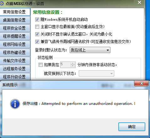 设置点晴MIS信息通保存时报错:Attempted to perform an unauthorized operation,如何解决?