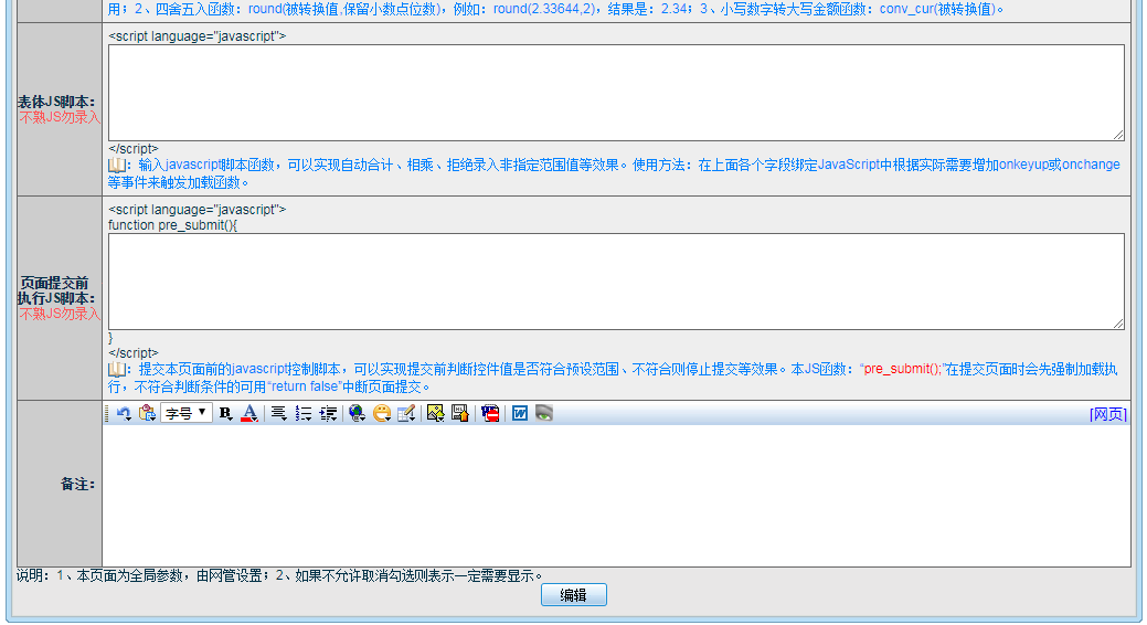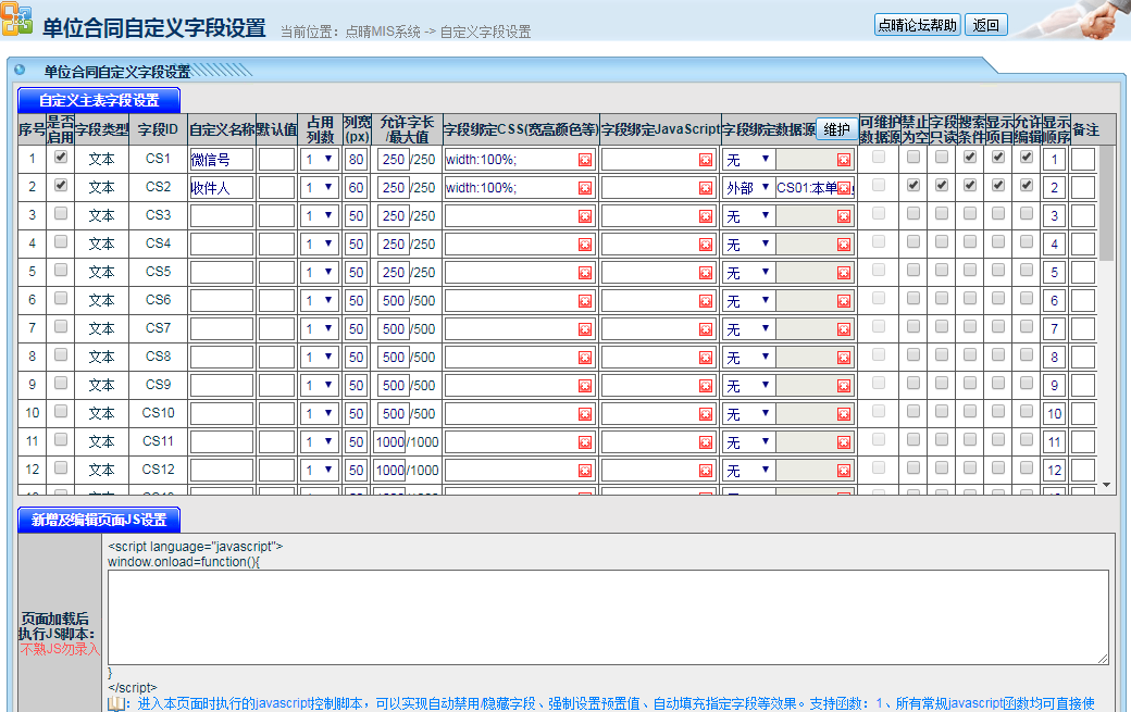 目前增加了自定义字段的有通讯录、单位合同管理、车辆预约管理、改善提案管理、人力资源管理、低值易耗品管理、固定资产管理、图书管理、项目追踪管理、EBR费用预算及报销管理等模块。 开启使用方法: 以管理员身份登录点晴OA,进入相应功能模块,在新增页面或列表页面上,找到“自定义字段管理”按钮: ![]() 说明:单位通讯录、个人通讯录、外部通讯录,均支持增加自定义字段。 ![]() 单位合同管理-》基础信息设置-》自定义字段管理 在以上位置找到并点击按钮“自定义字段管理”,设置需要增加的字段: ![]() ![]() 请仔细观察以上界面,可以设置增加的字段类型、长度、绑定CSS和JS、设置只读、是否允许编辑等,并且可以在页面上设置各种JS效果,实现各种需求: 1、序号:就是序号; 2、是否启用:如需要使用本字段,就要勾选启用; 3、字段类型:系统内置不可选,共20个文本型(5个250字长、5个500字长、4个1000字长、3个2000字长、3个4000字长)、5个数字型、5个日期型、5个富文本型(可上传图片和附件); 4、字段ID:系统内置不可更改,文本型CS开头、数字型number开头、日期型time开头、富文本型ntext开头,后面带流水号,页面上如果使用了JS效果,需要根据此ID获取相应控件; 5、自定义名称:对外显示的中文名称,一般控制在4个字以内为宜,如果勾选启用,则本字段必填; 6、默认值:新增时,本控件预置的值,一般留空即可,如果是数字型的话,建议默认值为0; 7、占用列数:系统内置值1/3/5/7/9,配合字段中文名称,占用列数加1,一般数字型和时间型强制为占用1列,文本型可以根据实际需求增加列数,例如字段为送货地址时,可以占用3列或5列; 8、列宽(px):本项用于列表查询页面,不用于新增和编辑页面,可以控制在列表查询页面中需要占用的宽度,用px记录绝对列宽; 9、允许字长/最大值:本项用于控制不允许录入太长的内容,用于文本型和数字型控件,后面最大值是允许使用的最大位数; 10、字段绑定CSS(宽高颜色等):本项用于控制控件的CSS效果,例如控件宽度、高度、里面内容的字体颜色、大小、背景色等,一般至少应该包括“width:100%;”,也就是控件满宽显示; 11、字段绑定JavaScript:本项用于控制控件是否需要使用JS来实现一些特殊的效果,例如只允许输入数字、英文、自动计算、自动取值等; 12、字段绑定数据源:本项用于控制控件是否需要自动填充内容,数据可以来源于直接自定义,也可以来源内部或外部其他数据库表,使用方法与工作流自定义SQL数据源一致; 13、可维护数据源:本项用于如果是直接自定义数据源时,是否允许新增时制单人自行维护数据源,勾选了,那么制单人就可以自行维护数据源,否则就只能使用网管事先预置的数据源; 14、禁止为空:本项控制操作人提交内容时,本控件内容是否允许为空,如果勾选了,那么提交时本控件就必须有内容才允许提交; 15、字段只读:本项控制控件是否允许操作人手工输入内容,如果勾选了,那么操作人要么彻底禁止录入本控件,要么只能点击选择绑定的数据源自动填充数据,灵活运用本字段,可以实现精确控制的效果; 16、搜索条件:本项目控制本字段是否在查询列表中,作为搜索条件使用,本项目在新增和编辑页面无效,只可用于列表查询页面; 17、显示项目:本项目控制本字段是否在查询列表中,作为显示条件使用,本项目在新增和编辑页面无效,只可用于列表查询页面; 18、允许编辑:本项目控制本字段在编辑页面中是否允许操作人更改字段内容,如果未勾选,则操作人无法更改本字段内容; 19、显示顺序:本项目控制各个被勾选的字段在新增、编辑、查看、列表查询页面中的字段显示顺序,从小到大升序显示各个字段; 20、备注:就是各个项目的备注了; 21、页面加载后执行JS脚本:进入页面时执行的JS脚本,可以用于强制禁用某个字段、给某给字段赋值、更改某给字段的CSS效果等; 22、表体JS脚本:一般放入JS的function函数,用于页面上控件绑定的JS脚本调用; 23、页面提交前执行JS脚本:一般用于页面提交前判断控件内容是否符合要求、自动计算某些控件内容等。 以下是增加字段后的新增、编辑、查看列表效果: ![]() 新增界面增加的自定义字段效果 ![]() 编辑页面增加的自定义字段效果 ![]() 查看列表,可以设置为查询条件、是否显示等效果。