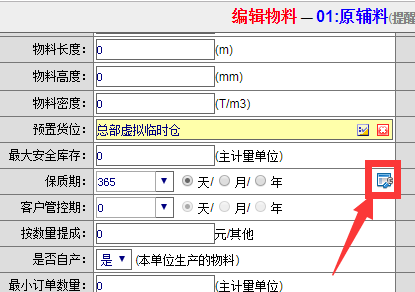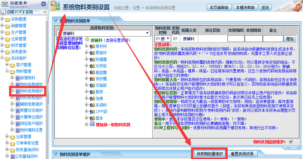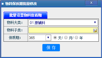 在以下两个位置可以打开按照物料类别批量修改保质期功能: 方法一 找到物料类别维护菜单,进入后,在下面会看到按钮“保质期批量维护”,点击即可进入: 方法二 在物料维护菜单中,进入物料基础信息维护界面,在保质期后面有一个维护图标,点击即可进入保质期批量维护界面: