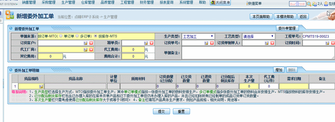 生产管理——委外加工管理——新增委外加工单,如下图所示: 点晴模切ERP更多信息:http://moqie.clicksun.cn,联系电话:4001861886 该文章在 2019/10/15 8:17:42 编辑过 |