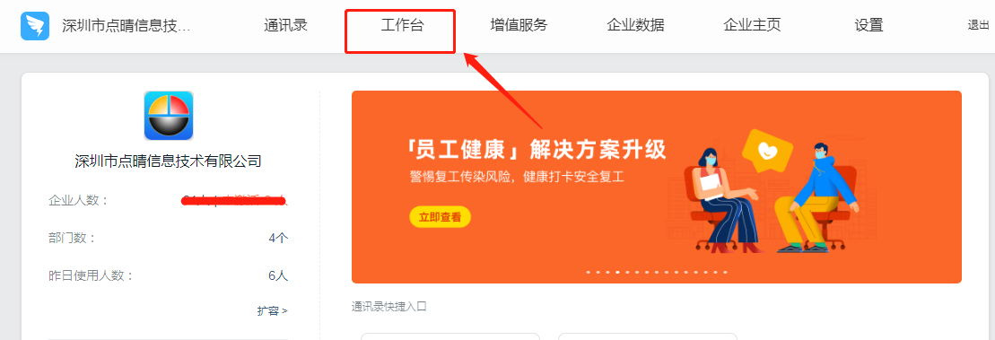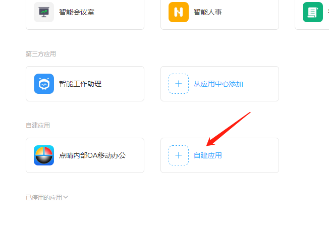 2、登陆管理后台后点击工作台,进入工作台选择自建应用,进入钉钉开放平台。