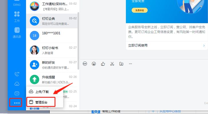 1、钉钉管理员登陆钉钉PC客户端,点击管理后台并登陆管理后台。 管理后台密码属于管理员专用必须记住并使用后台管理员密码。