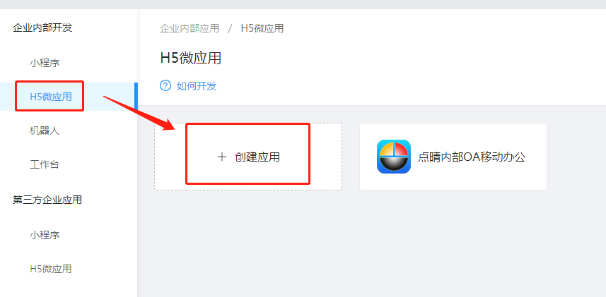 3、在钉钉开发平台点击应用开发,进入企业内部应用开发选择H5微应用,并创建应用。
