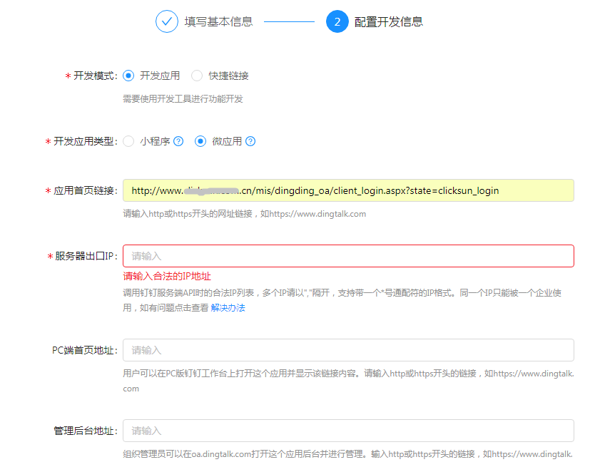 5、开发模式选择开发应用、微应用,并录入应用首页 应用首页链接:http://贵司域名/mis/dingding_oa/client_login.aspx?state=clicksun_login 服务器出口IP:贵司固定IP地址(此IP务必就是上面贵司域名所映射的公网IP)