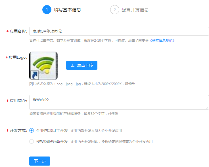 4、录入应用名称、logo、简介、选择企业内部自主开发点击下一步。