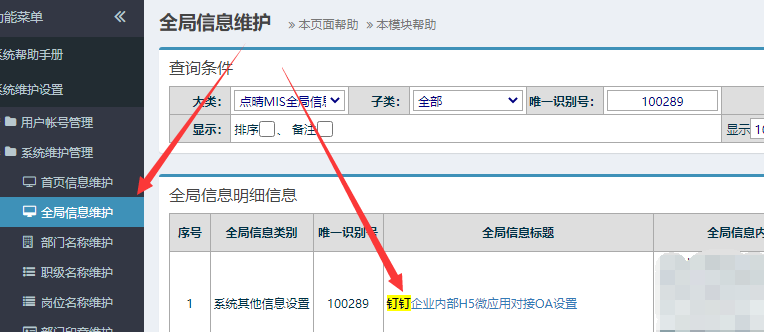 6、使用管理员账号进入OA,顶部 设置-》全局信息维护-》100289:钉钉企业内部H5微应用对接OA设置 填写以下内容。教程:如何查询钉钉的CorpId、AgentId、AppKey等信息? 配置完成后即可在钉钉应用中使用点晴MIS信息通。 该文章在 2021/7/30 11:28:54 编辑过 |