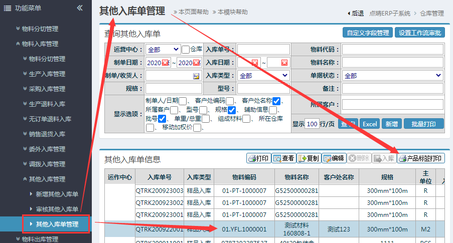 直接选择明细,点击“产品标签打印”按钮打印: 用途:其他入库标签用于物料/成品识别,之后可结合点晴MES版APP用于后续扫码出库,扫码盘点,扫码查询等操作 ![]()