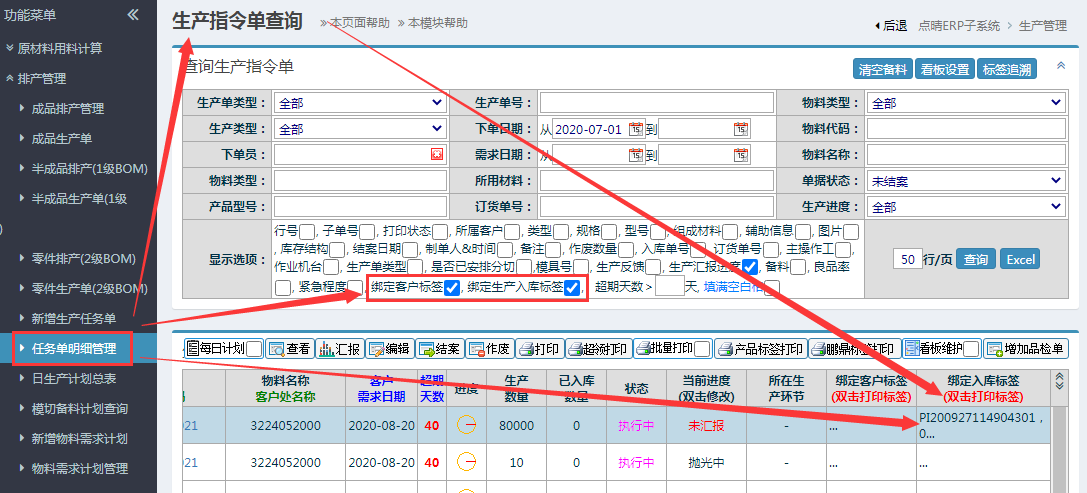 双击明细“绑定入库标签”栏制作标签并打印: 用途:生产入库标签打印后需结合点晴MES版APP进行入库,入库后可结合用于后续扫码出库,扫码盘点,扫码查询等操作