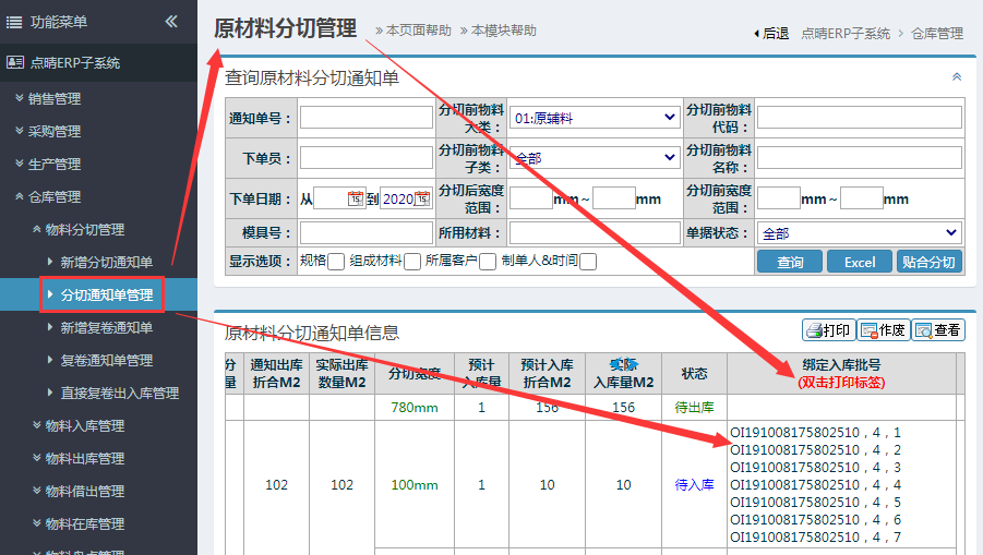 双击明细“绑定入库批号”栏制作标签,并打印: 用途:分切标签打印后需结合点晴MES版APP进行扫码入库,扫码入库后可用于后续扫码出库,扫码盘点,扫码查询等操作 ![]()