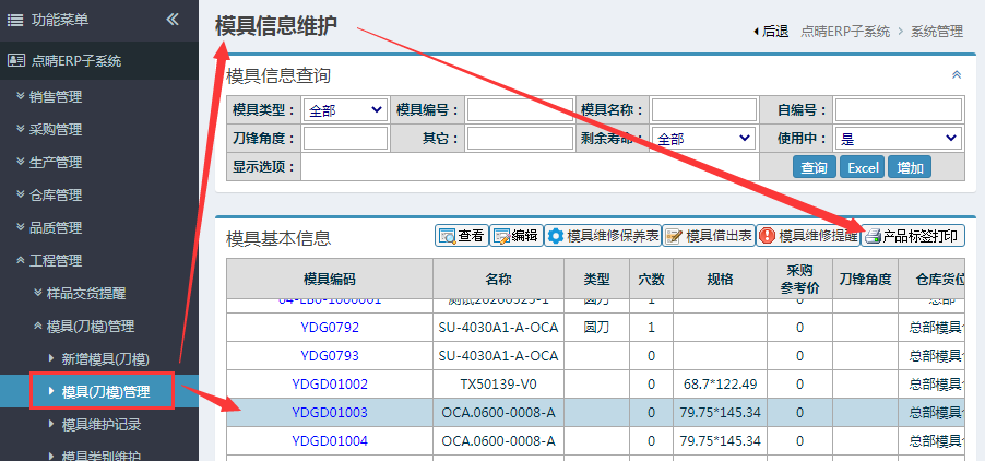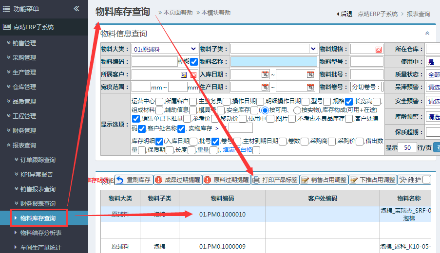 选择模具明细-点击“产品标签打印”按钮打印: 用途:模具标签打印后需结合点晴MES版APP进行扫码绑定工单领出,扫码进行归还操作 ![]() 操作步骤: 报表查询-物料库存查询, 选择库存明细-点击“打印产品标签”按钮打印: 用途:库存标签一般用于遗失标签补充,可结合点晴MES进行扫码出库,扫码盘点,扫码查询等操作 ![]() 操作步骤: