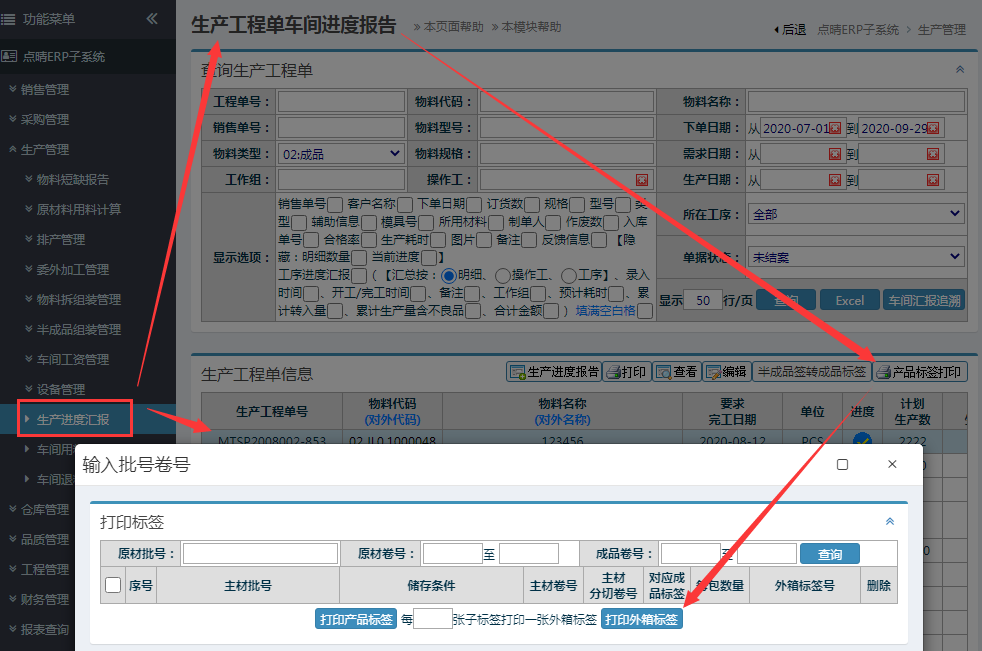 直接选择明细,点击“产品标签打印”按钮打印: 用途:无订单入库标签打印后需结合点晴MES版APP进行扫码入库,扫码入库后可用于后续扫码出库,扫码盘点,扫码查询等操作 ![]()