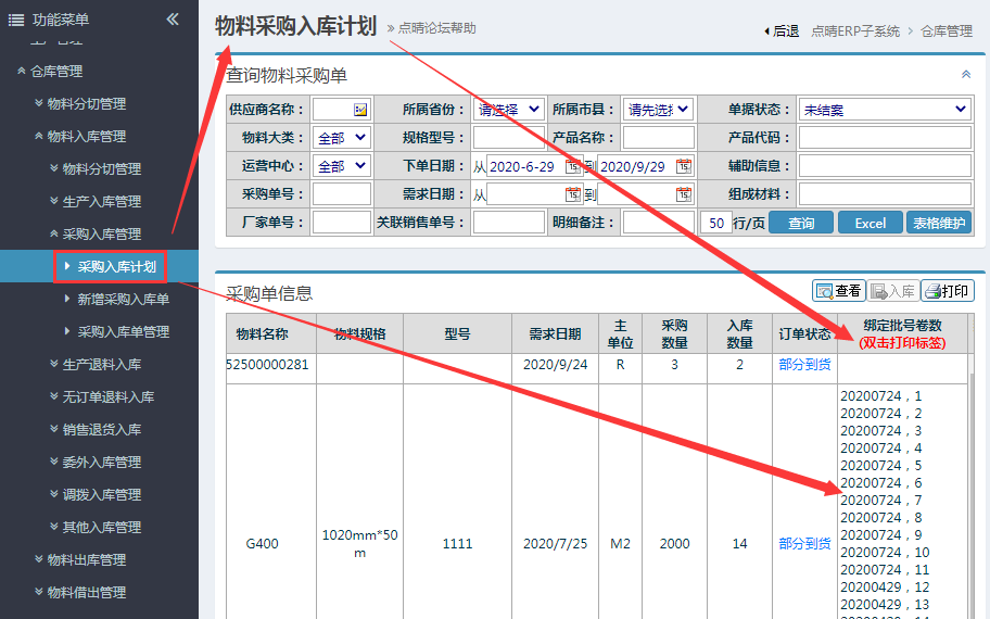 ![]() 操作步骤:仓库管理-物料入库管理-采购入库管理-采购入库计划,双击明细“绑定批号卷数”栏制作标签,并打印: 采购标签打印后需结合点晴MES版APP进行扫码入库,扫码入库后可用于后续扫码出库,扫码盘点,扫码查询等操作 ![]()
