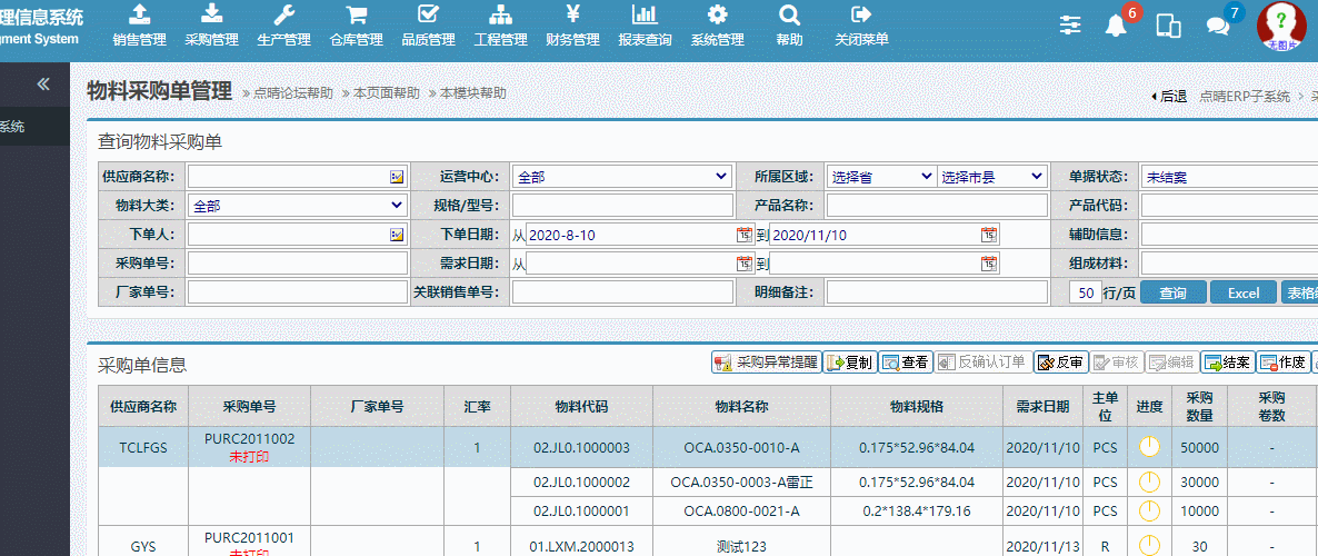 点晴模切ERP采购单异常结案