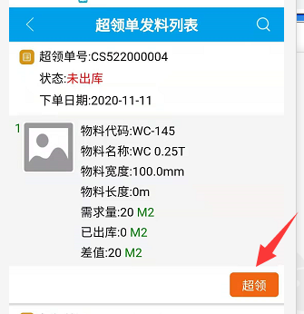 进入页面,核对超领单号,找到对应的单据,点击超领按钮