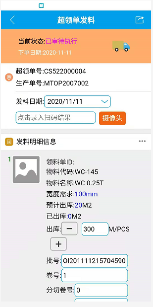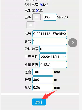 进入页面后,扫码需要领出的标签,扫描后点击发料按钮完成操作,如下图所示: