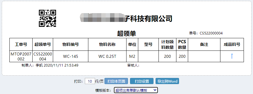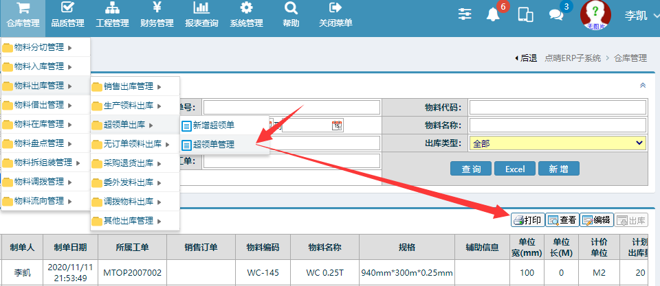 仓库管理——物料出库管理——超领单出库——超领单管理,进入页面点击打印按钮