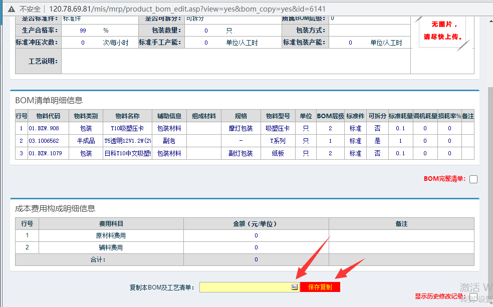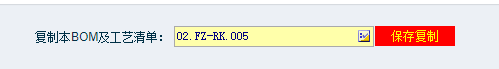 ERP复制BOM操作指引 操作步骤:工程管理-生产BOM管理-选择已经建好BOM的成品(半成品)-点击复制按钮,如下图所示: 进入页面后,到页面最下方,点击选择没有BOM的成品(半成品)资料