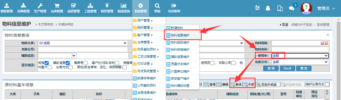 点晴模切ERP物料作废与激活操作