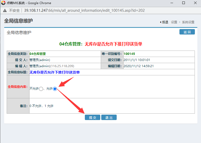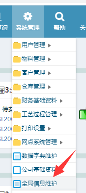 操作步骤:系统管理-全局信息维护,如下图: 点击对应的链接进行修改 选择允许-点击提交按钮设置完成 点晴模切ERP更多信息:http://moqie.clicksun.cn,联系电话:4001861886 该文章在 2021/1/27 16:32:55 编辑过 |