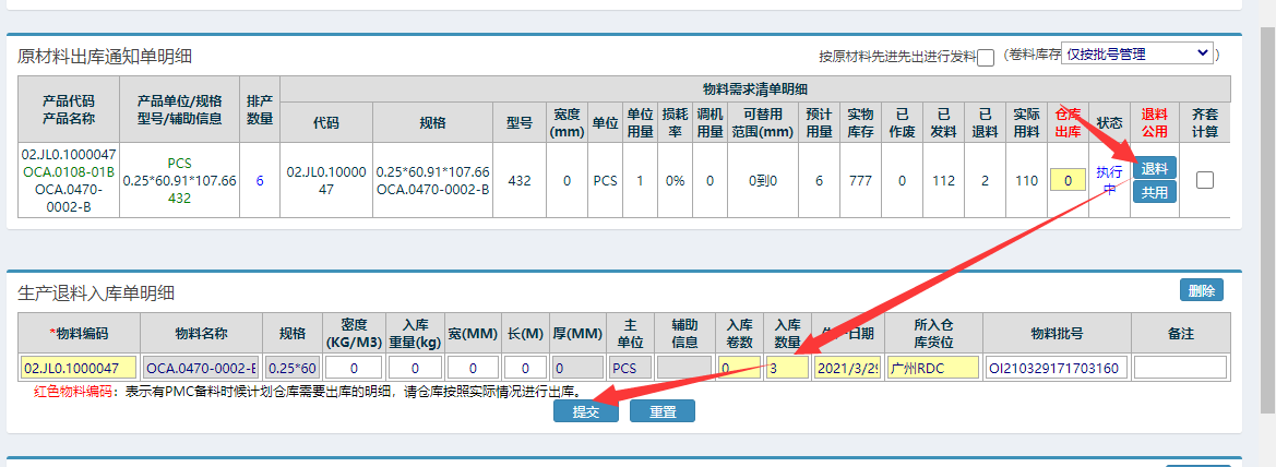 进入页面——选择需要退料的明细——点击退料按钮——录入对应的数量——点击提交即可