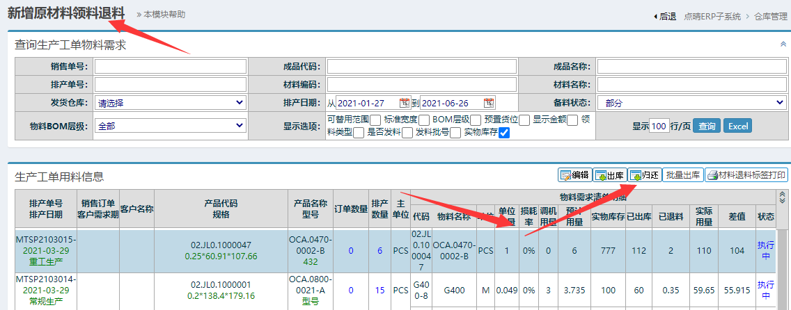 进入到原材料领料退料页面——选择对应的工单明细——点击“归还”按钮