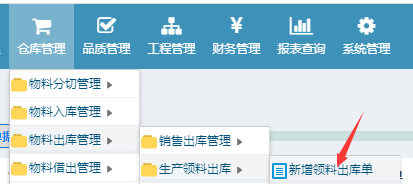 操作步骤:仓库管理——物料出库管理——生产领料出库——新增领料出库单