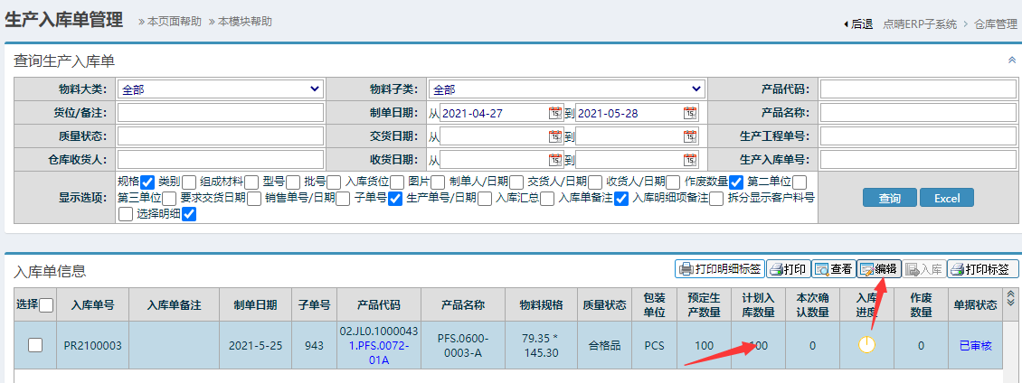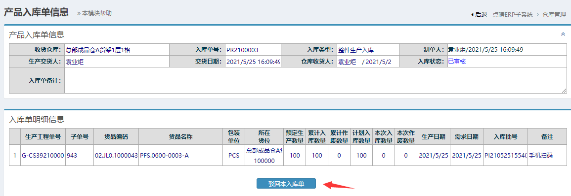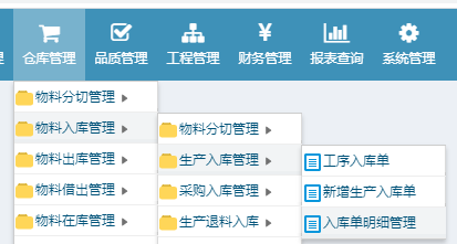 操作步骤:仓库管理-物料入库管理-生产入库管理-入库单明细管理