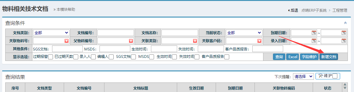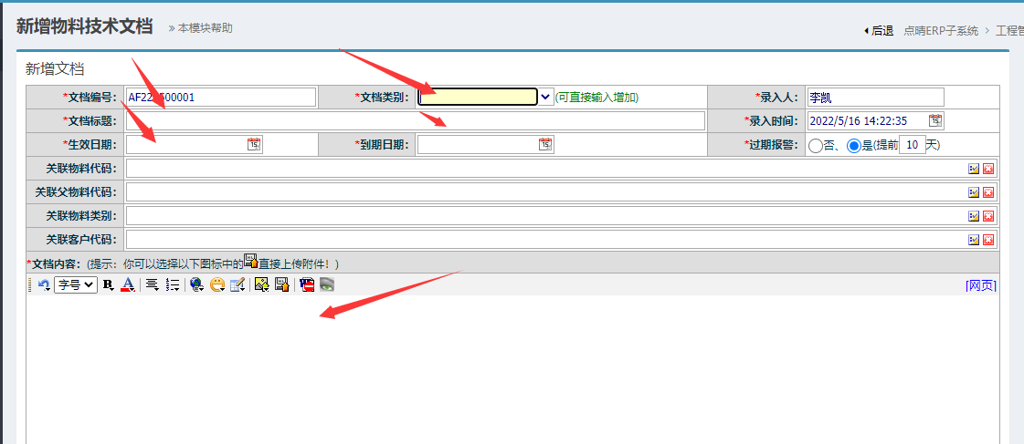 进入界面后,录入/选择对应的文档类别,录入文档标题,生效日期,到期日期,上传对应文档等信息后提交完成