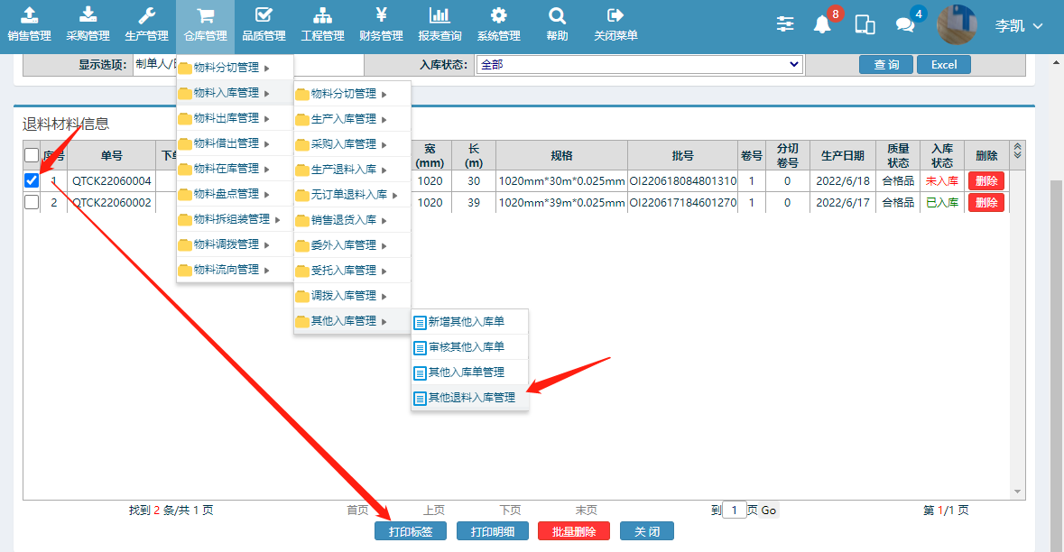 操作步骤:仓库管理-物料入库管理-其他入库管理-其他退料入库管理,如下图