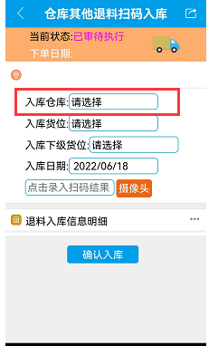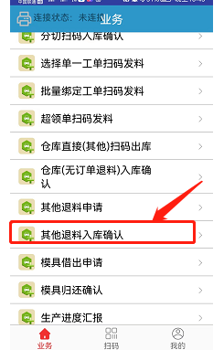 步骤:打开APP,找到“其他退料入库”菜单进入界面