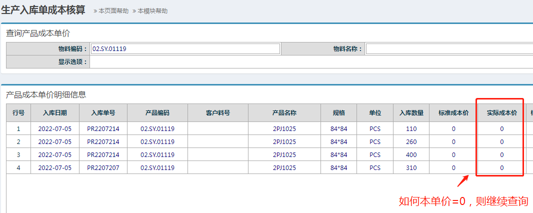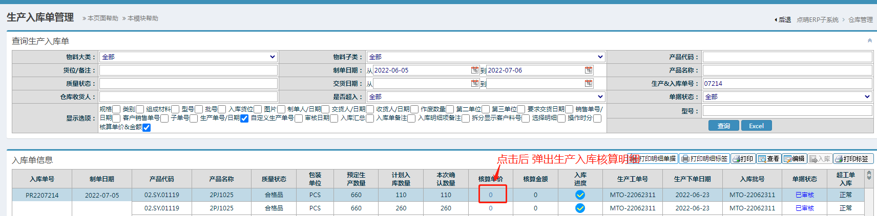 [点晴模切ERP]请问为什么查询生产入库单管理中的核算单价是零?